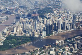 Downtown Brisbane při ranním odletu. Barva vody v řece Brisbane je hnědá z důvodu velkých záplav v celé oblasti.