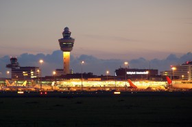 Pohled na terminály letiště AMS z vyhlídky od RWY 09/27