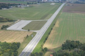 Letecký pohled na jedno ze záložních "dálničních" letišť na území ČR nacházející se u Vyškova. Na fotografii je dobře patrný betonový povrch po celé šířce uvažované dráhy, bez travnatého oddělovacího pásu mezi pruhy. Velmi dobře patrné jsou i stojánky na koncích 2500m dlouhé a 25m široké dráhy. Mezi nimi vyrostlo travnaté letiště Vyškov (LKVY) a postupně i muzeum (na fotografii vlevo nahoře). Na rozdíl od záložního letiště na dálnici D1 nedaleko Měřína, toto nikdy nebylo využito pro přistání letounů.