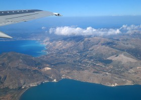 Tento pohled se naskytne cestujícím odlétajícím z ostrova Kefalonia. Fotografie byla pořízena z paluby letadla B737-300 společnosti Seagle Air.