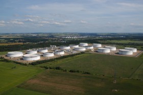 Letecký pohled na strategické zásoby ropy pro Českou republiku nedaleko Nelahozevsi. V 16 obřích nádržích (největší o průměru 84m a výšce 24m) je skladována ropa jak z ropovodu Družba tak i IKL (Ingolstadt), vystačující naší zemi na více než čtvrt roku. Celý objekt sleduje 65 kamer a nádrže jsou vícevrstvé z 38mm pancíře, aby vyhověly bezpečnostním opatřením. Foceno z paluby Tecnamu, v pozadí město Kralupy.