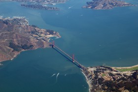 Pohled na zátoku Golden Gate a ikonický Golden Gate Bridge. Přílet do SFO v PH-BFY.