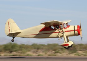 Tento krásně zrestaurovaný Beechcraft D17S Staggerwing z roku 1944 nouzově přistál v říjnu 2011 bez podvozku a byl výrazně poničen, i když nikdo nebyl zraněn. Zase létá v plné kráse, snímek je z Coolidge Fly In.